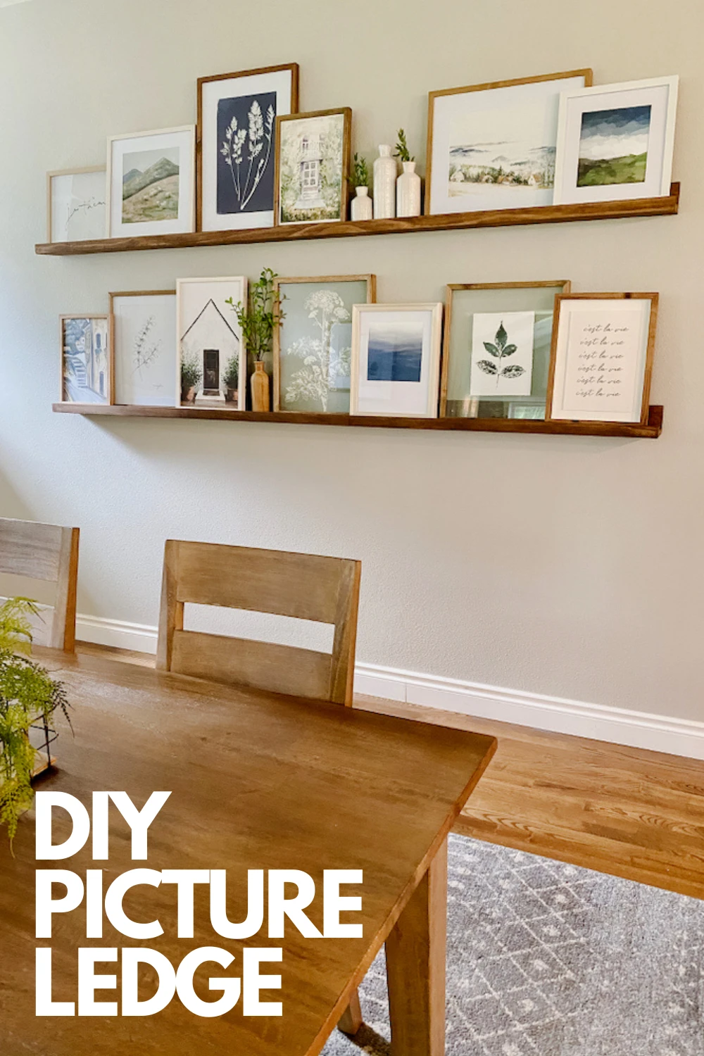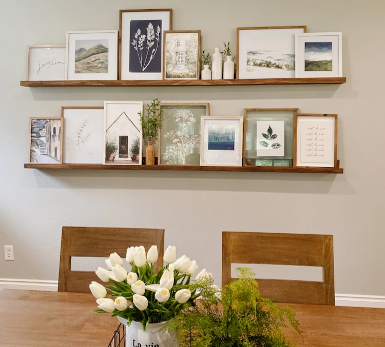 We have a very large wall in our kitchen dining area and I was hoping to add two long wood art ledges. I shopped around and I found that either the shelves were too short or just too expensive. I knew my husband and I could probably make what I was looking for at a fraction of the cost. And we did! I am so happy with how they turned out, how easy they were to make and how inexpensive they were to build. If you aren’t feeling very DIY, you can buy the Picture Ledges in various sizes and stains from Etsy. If you want to make your own, check out the instructions below!