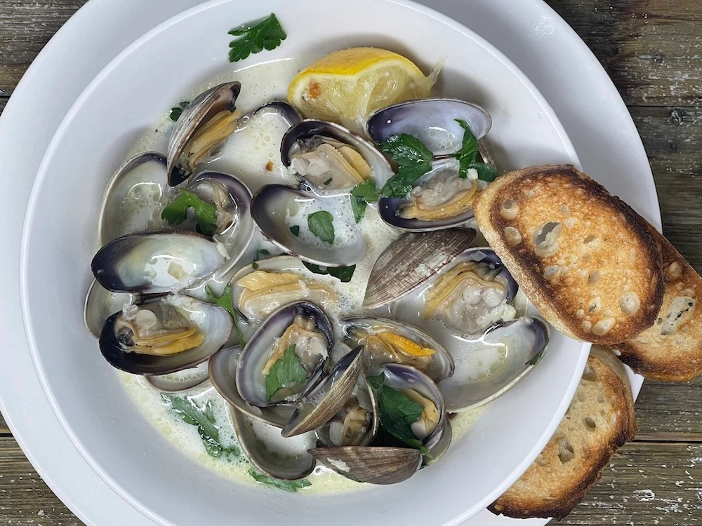 - Place lid on pan and allow clams to steam and open (discard any clams that do not open)