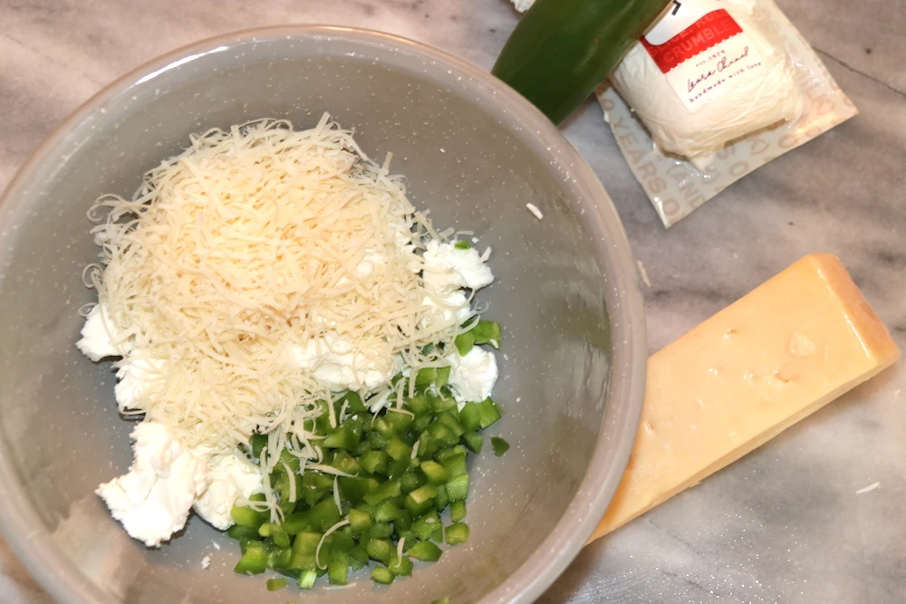 - In bowl, add goat cheese, parmesan, diced jalapeños, and salt and pepper