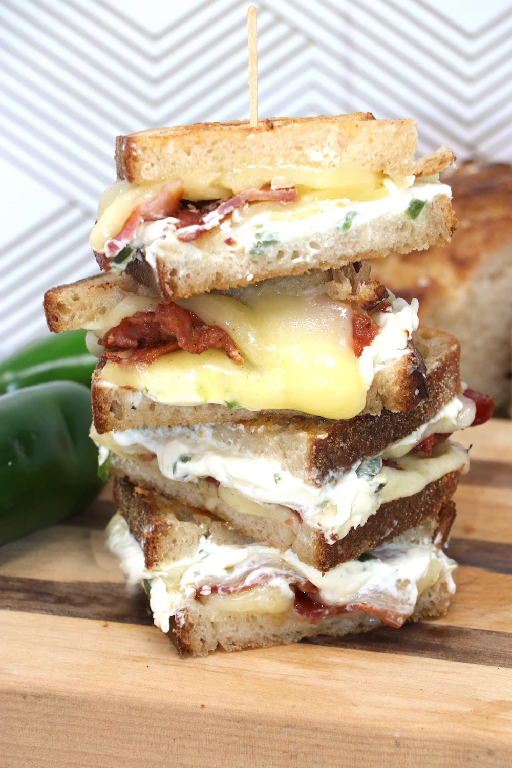 Spread the jalapeño filling on 1 slice of bread and top with sharp cheddar cheese. On the other slice of bread, add a slice of Cheddar and Monterey Jack cheese. Add your bacon and stack sandwich slices together. Generously butter the outside of the sandwich on both sides.