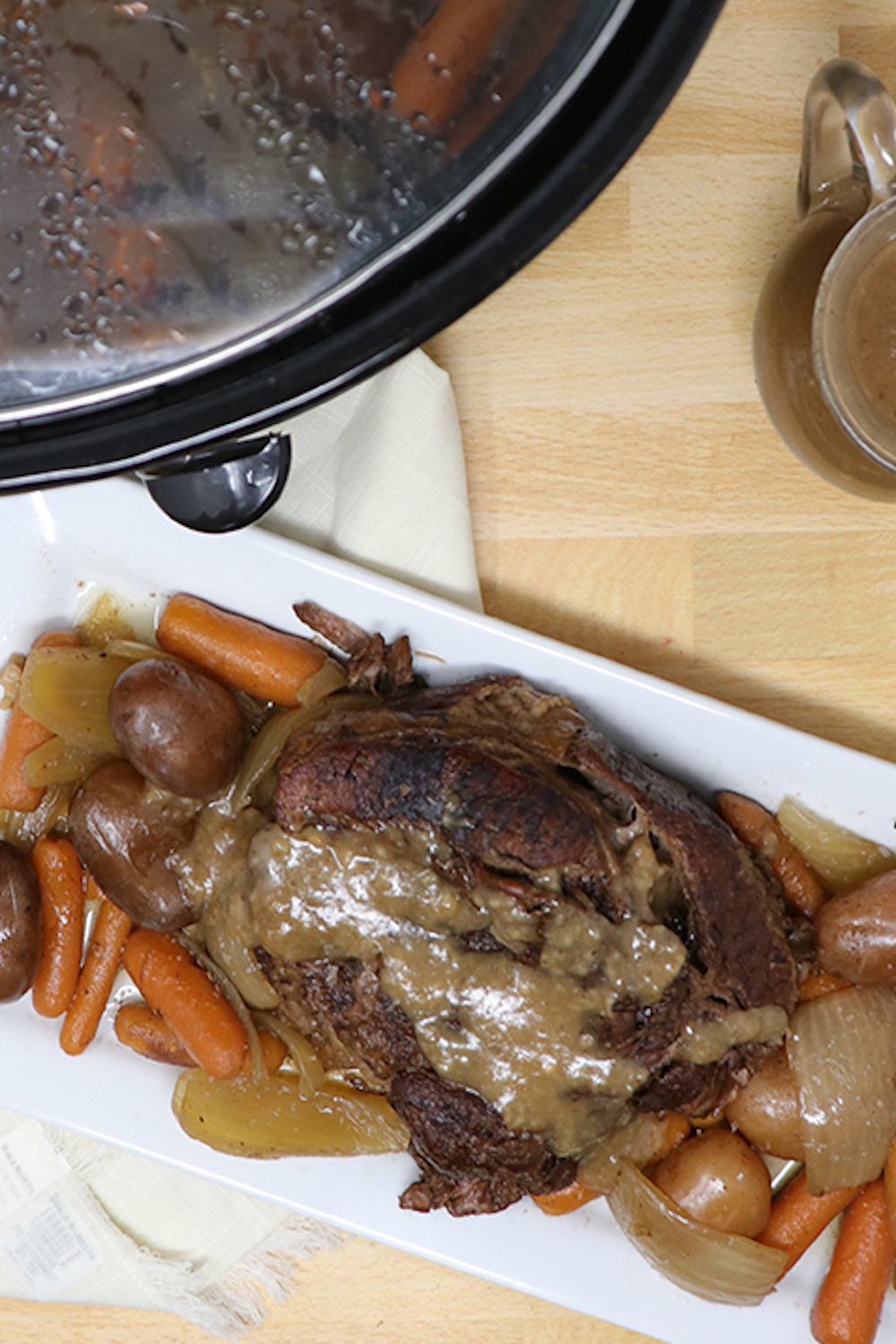 - Remove the roast and vegetables from the slow cooker and cover with foil to keep warm