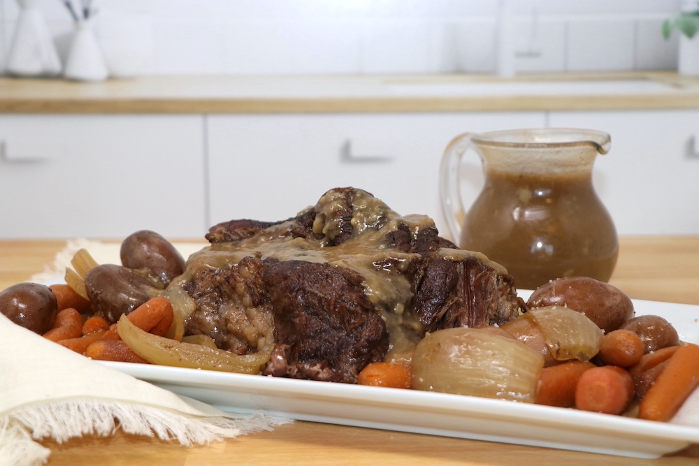 - Place the roast onto a serving dish and top with gravy